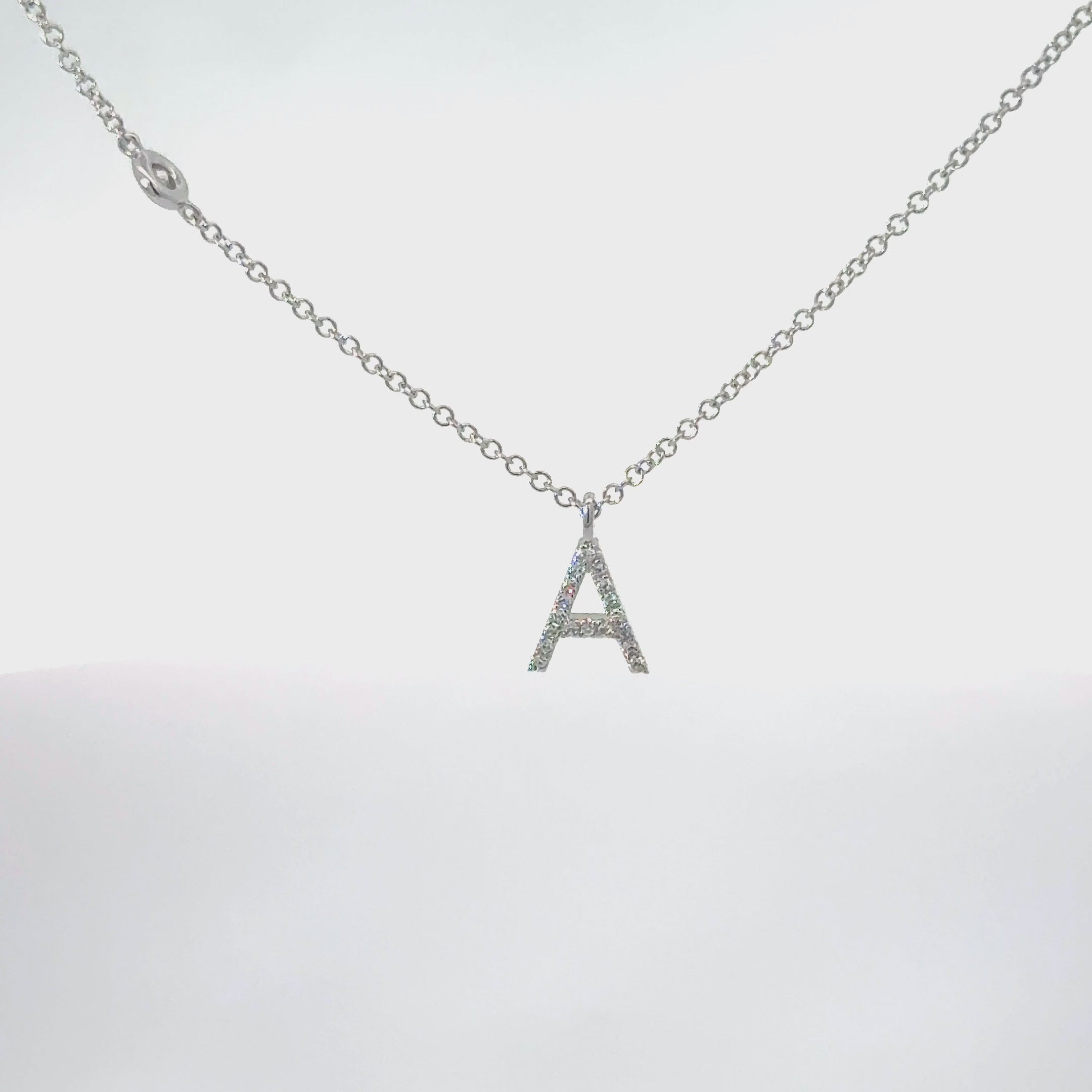 This exquisite 14kt white gold pendant necklace showcases a sparkling letter 'A' adorned with shimmering .09ct diamonds. Its delicate design is both timeless and versatile, making it the perfect accessory for any outfit or occasion. Whether you're looking to treat yourself or gift someone special, this elegant piece promises to add a touch of personalized elegance.